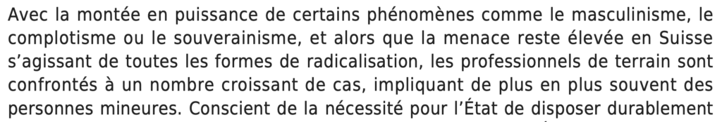 Mais un détail de la communication officielle interpelle : pour justifier son inquiétude, l’État cite « la montée en puissance de certains phénomènes comme le masculinisme, le complotisme ou le souverainisme. »