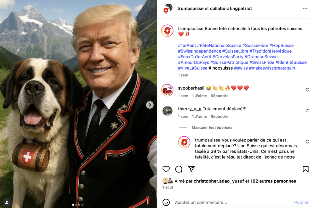 Trumpiste et Suisse, serait-ce en train de devenir un oxymore ? Tel n’est pas l’avis de notre Comité Trump Suisse. Sur Instagram, où il est très actif, ce dernier publiait même une image du président américain en armailli à l’occasion du 1er Août, en pleine onde de choc liée aux nouvelles taxes. Un milliardaire new-yorkais, coiffé comme un armailli, en plein cœur d’une tempête commerciale ? Osé, assurément, mais pour ces inconditionnels, la responsabilité du coup de massue revient à nos élus, et pas à leur héros : « Cet échec n’est pas une erreur, c’est une stratégie : affaiblir nos liens avec les États-Unis pour mieux nous pousser dans les bras de l’Union européenne », avancent-ils même face aux critiques, venues parfois de droite.