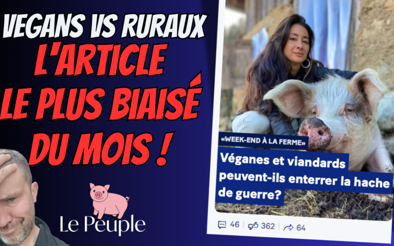 Deuxième biais remarquable de l’article : la manière dont la militante antispéciste Virginia Markus « explique » deux fois telle ou telle chose au lecteur dans ses diverses citations, tandis qu’un agriculteur « grogne » (sic) son opposition au véganisme. Spectaculaire tour de passe-passe : la personne qui représente la majorité de la population, à 95 % omnivore, est présentée comme extrémiste, tandis que celle qui porte les couleurs des 0,7 % de végans est placée en situation d’autorité. Pire, quand l’agriculteur dit son souci de faire son métier correctement, il « prétend » faire attention au bien-être animal, glisse le journaliste.