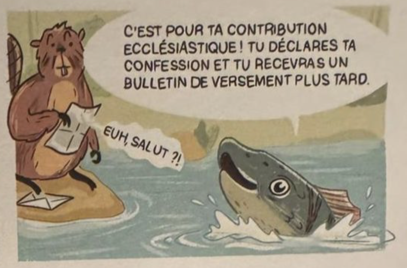 Attention : je ne dis pas que vous ne faites rien. Dans votre bande dessinée, un monsieur poisson explique d’ailleurs très consciencieusement au castor dubitatif ce que deviendrait son argent : accompagnement des personnes âgées, catéchisme, aide aux plus démunis, célébrations. Fort bien.