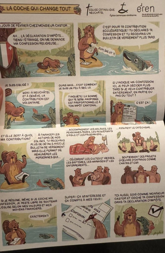 C’est pourtant à lui que vous avez confié, dans un message d’information diffusé à l’échelle de votre canton, la mission d’expliquer aux contribuables comment cocher la case correspondant à leur confession dans leur déclaration d’impôts. Catholique, réformé ou catholique chrétien, le contribuable-castor est ainsi invité à faire un premier pas pour soutenir votre action grâce à ses deniers.