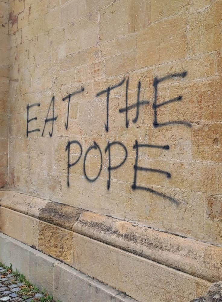 Il y a néanmoins une nation qui échappe à votre mépris : c’est la nation palestinienne, dont vous appelez à la libération. Comme catholique, je suis sensible à cette question — moi dont les frères et sœurs ne sont pas moins bombardés que les autres habitants de Gaza, comme l’a montré la récente attaque contre l’église de la Sainte-Famille. Peut-être avez-vous aussi entendu parler des chrétiens de Taybeh, excédés par les violences des colons israéliens : ils peineraient à comprendre que vous défendiez leur cause en attaquant, vous aussi, une église. Malgré cela, vous appelez à « manger le pape », comme vous l’écrivez délicatement en anglais (donc dans la langue de l’empire). N’est-il pourtant pas un allié objectif du combat pour la paix dans la région ? Je connais bien des gens qui lui prêtent des tendances bien trop pro-arabes, dans certains milieux. Et, pendant qu’on y est, pourquoi inscrire ce message sur une église réformée ? Votre GPS révolutionnaire a perdu la connexion, ce me semble.