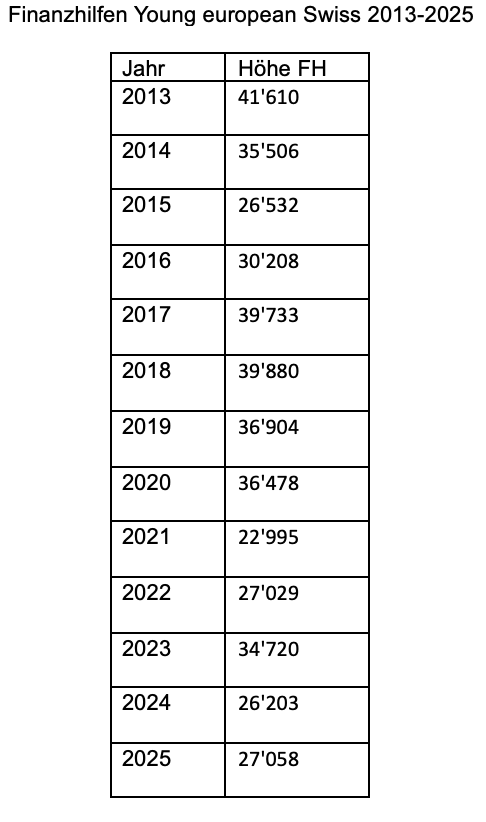 Quel peut bien être le rapport entre l’activité du Mouvement européen et la loi fédérale mentionnée, qui concerne l’encouragement des activités extrascolaires des enfants et des jeunes ? Pour en avoir le cœur net, nous avons interrogé la Confédération. Dans une réponse détaillée — mais très largement rédigée en allemand — l’Office fédéral des assurances sociales précise qu’il ne s’agit pas du Mouvement européen en tant que tel, mais de son organisation de jeunesse, Young European Swiss, également appelée « yes », qui bénéficie de ce soutien depuis 2013. En 2025, le montant a d’ailleurs été légèrement revu à la hausse par rapport aux chiffres figurant dans le rapport d’activité, pour atteindre 27’058 francs.