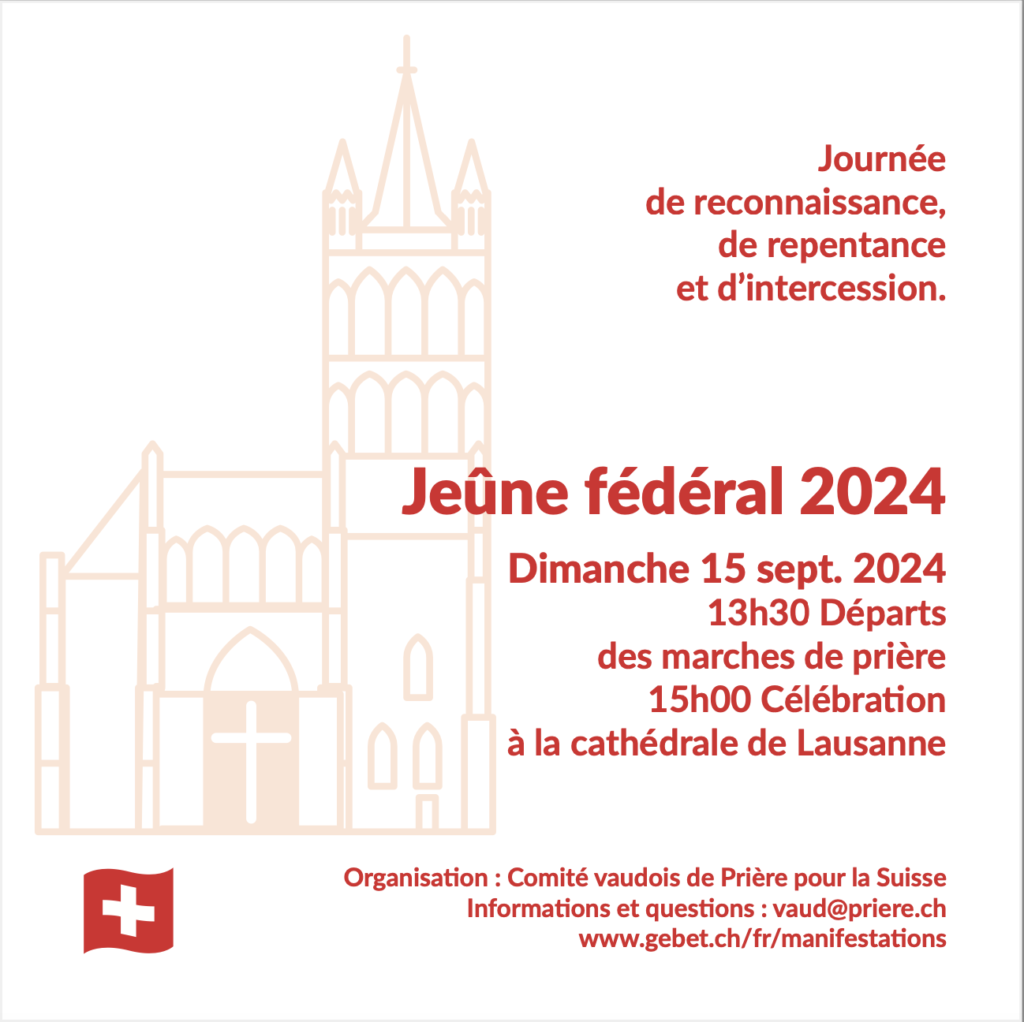 Techniquement, quatre marches partiront à 13h30, depuis la station métro du CHUV, au Tribunal fédéral à Mont-Repos, au bas du Petit-Chêne, et au Palais de justice de Montbenon pour converger vers la cathédrale où se vivra une célébration à 15h00. Habituellement desservis par l’Église évangélique réformée du canton de Vaud (EERV), les lieux seront donc momentanément aux mains de croyants de sensibilité plus évangélique. Mais la responsable communication Carole Delamuraz précise : « Le jeûne et la prière sont des éléments de la spiritualité réformée », même si aucun événement particulier n’est prévu. Son Église n’émet d’ailleurs pas de recommandation particulière de jeûne mais un appel général – sous la forme d’un message de l’EERV – sera diffusé, et de façon usuelle, il accompagne le message du Conseil d’État que l’Église réformée vaudoise diffuse également.