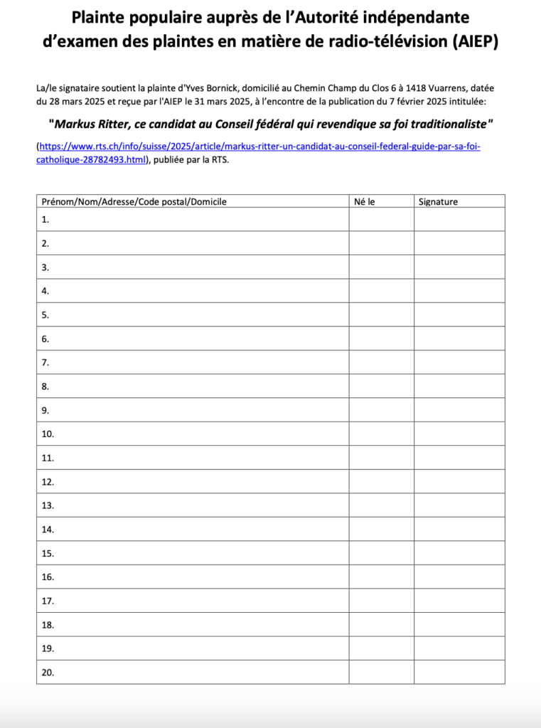Dans sa réponse, l’Autorité indépendante d’examen des plaintes en matière de radio-télévision AIEP reste pour l’heure très sobre. Elle rappelle simplement que la plainte nécessite 20 signatures avant le 1er mai 2025 pour pouvoir être prise en compte. « Les personnes physiques qui cosignent une plainte doivent être âgées de 18 ans au moins et avoir la nationalité suisse ou être titulaire d’un permis d’établissement ou de séjour», souligne l’autorité. Les cosignataires doivent en outre indiquer leur nom, leur adresse, leur date de naissance et apposer leur signature.