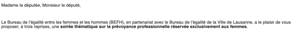 « Madame la députée, Monsieur le député, le Bureau de l’égalité entre les femmes et les hommes (BEFH), en partenariat avec le Bureau de l’égalité de la Ville de Lausanne, a le plaisir de vous proposer, à trois reprises, une soirée thématique sur la prévoyance professionnelle réservée exclusivement aux femmes. »