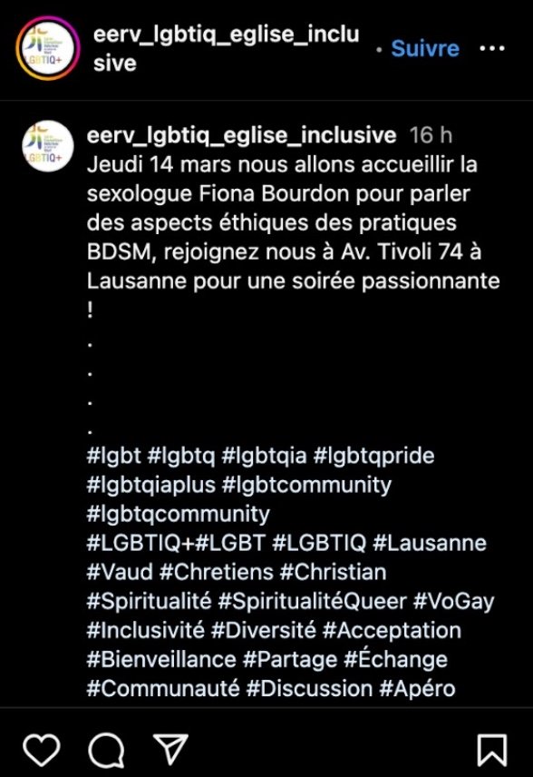 Voilà quelques extraits, en vérité fort beaux, des principes constitutifs de l’Église évangélique réformée du Canton de Vaud. Cette semaine, pourtant, cette même Eglise propose au public une soirée sur le thème du sadomasochisme (ou BDSM) éthique, dont voici la description sur le réseau social Instagram.